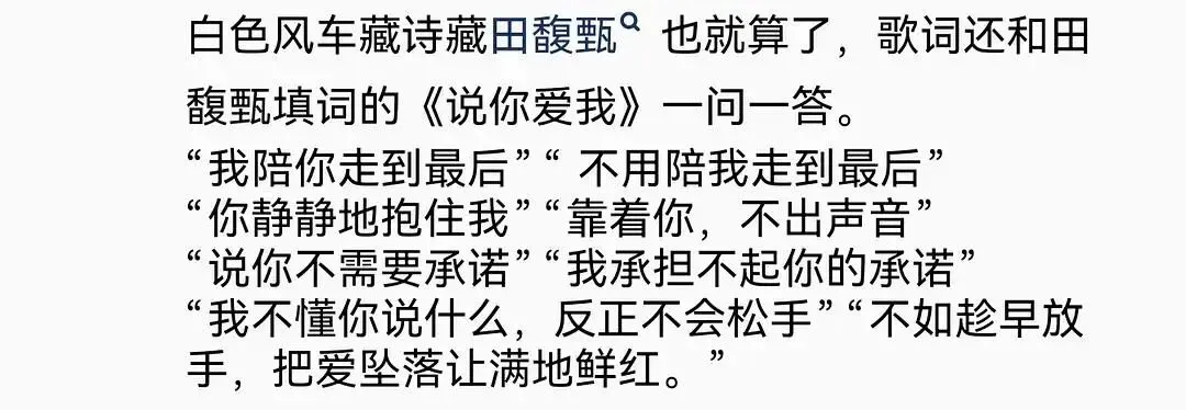 “没官宣的恋爱,被写进了一首不太敢再唱的歌。”(网传情绪解读)