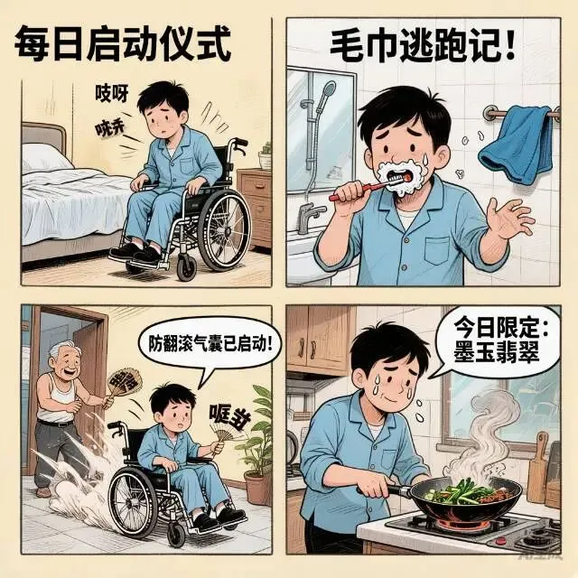 清晨六点半,我的闹钟不是手机铃声,是隔壁装修队的电钻声——感谢他们,让我不用设闹钟也能准时睁眼。掀开被子就像启动一台老旧的轮椅,关节发出“吱呀”的抗议,我把自己从床上“平移”到轮椅上,动作熟练得像拆快递。这具身体啊,像台出厂设置有点bug的机器,四肢不听使唤,脑子却格外活跃,总在琢磨怎么把“故障日常”过成喜剧片。