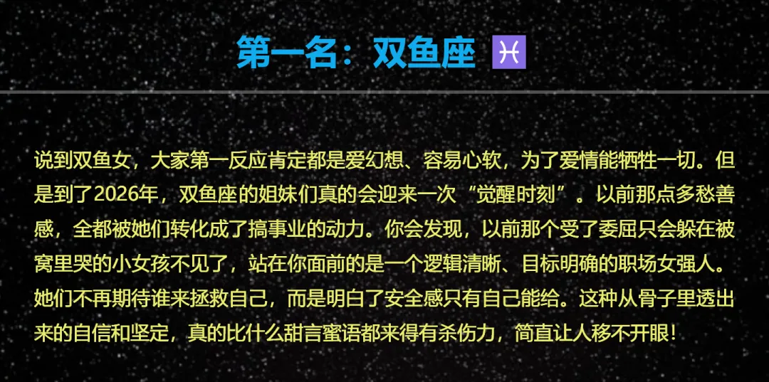 姐妹们,听我一句劝,2026年真的要变天了!以前咱们总说“恋爱脑”误事,一碰感情就智商下线,但星象显示,到了2026年,有三个星座的女生简直是像开了挂一样,彻底清醒过来。那些为了男人哭哭啼啼的日子一去不复返,取而代之的是一心搞钱、专心搞事业的大女主剧本。这种理智又清醒的状态,反而让她们的魅力值直接拉满,挡都挡不住!快来看看,这其中有没有你,或者你身边的那个“她”?