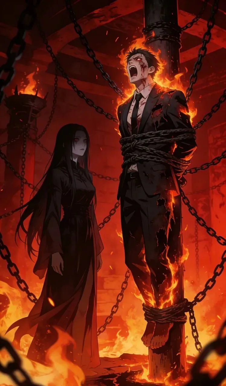 16. 地狱烈火熊熊燃烧,厉鬼将骗子绑在火刑柱上,让他受尽烈火灼烧,受尽痛苦,偿还所有罪孽。