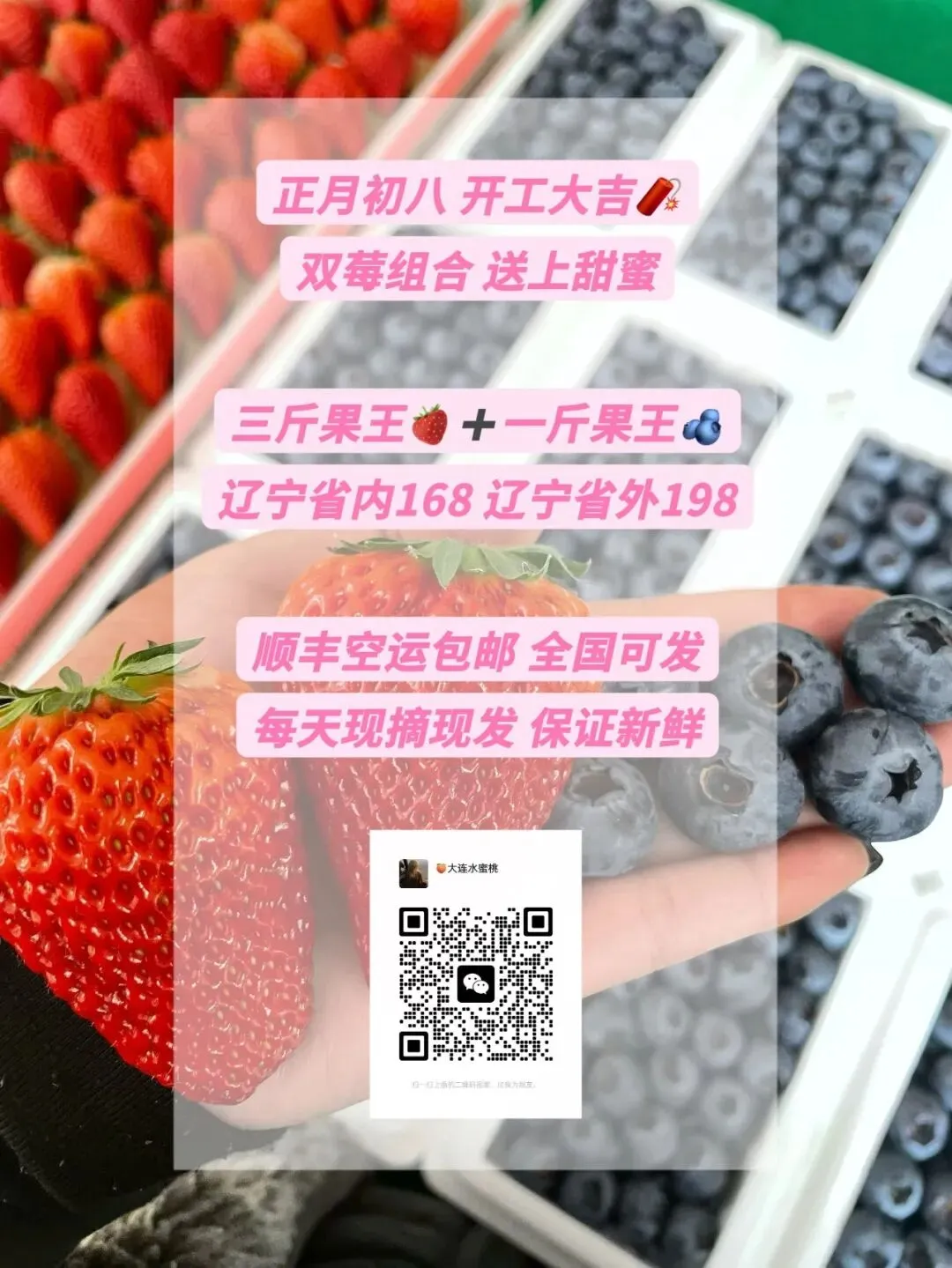 又到了水蜜桃女士的营业时间,过完年了,丹东九九草莓🍓、丹东L25花香蓝莓大降价,今日推出“双莓组合”,一次下单,品尝两种美味!全部都是现摘现发,又大又甜又新鲜,欢迎扫描下方二维码添加我的微信🛰,欢迎随时问价下单,添加时请备注“买水果”。