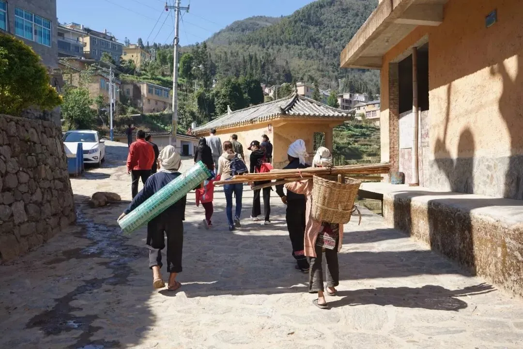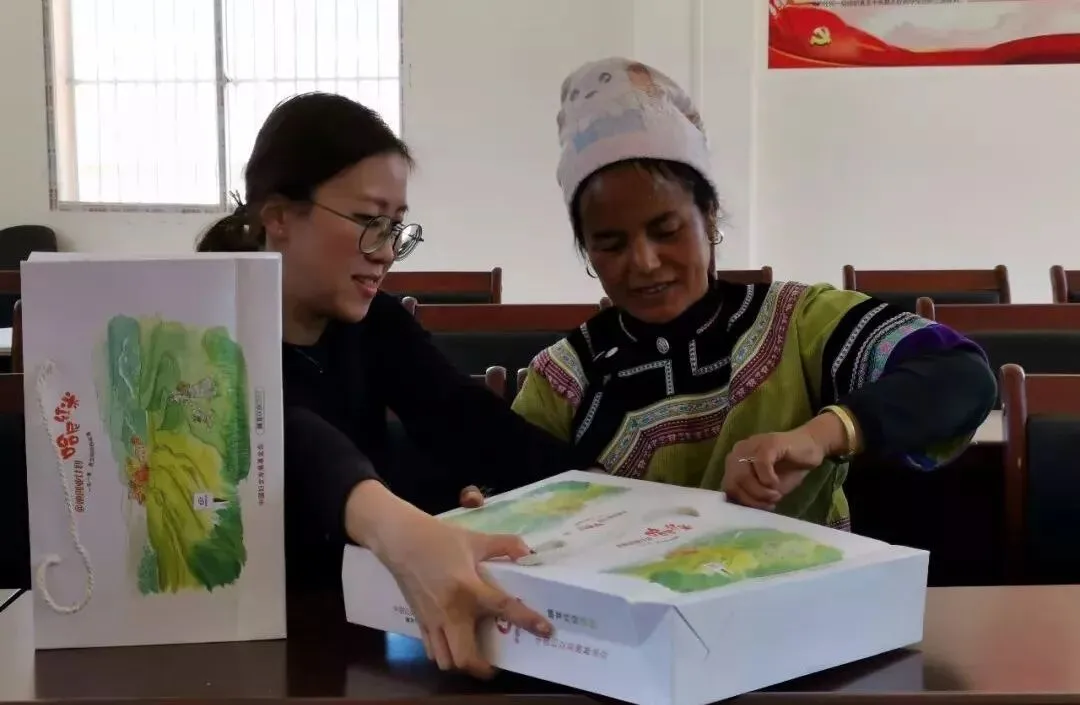 建行工作人员与哈尼妇女一起学习包装红米
