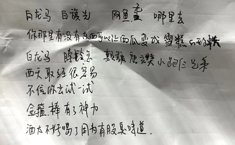 白龙马,白旗先,网鱼无,哪里去……脖铃急……西天取经很容易,不信你去试一试,金箍棒有了神力……