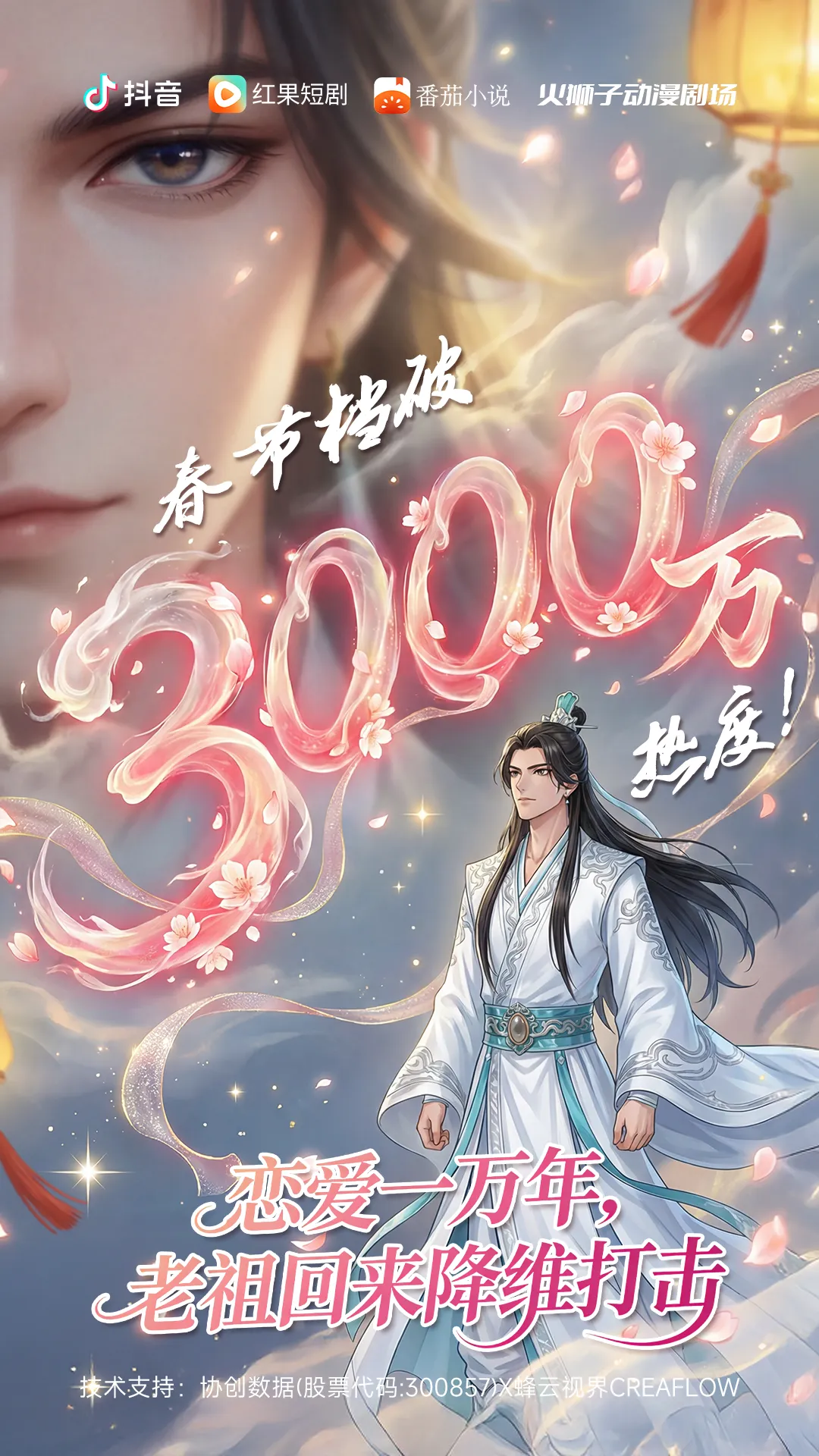 捷报传来!马年春节档,由火狮子AIGC倾力参与制作的男频古风玄幻漫剧《恋爱一万年,老祖回来降维打击》在红果漫剧App热度强势突破3000万!(到目前截止具体热播数值3103万)