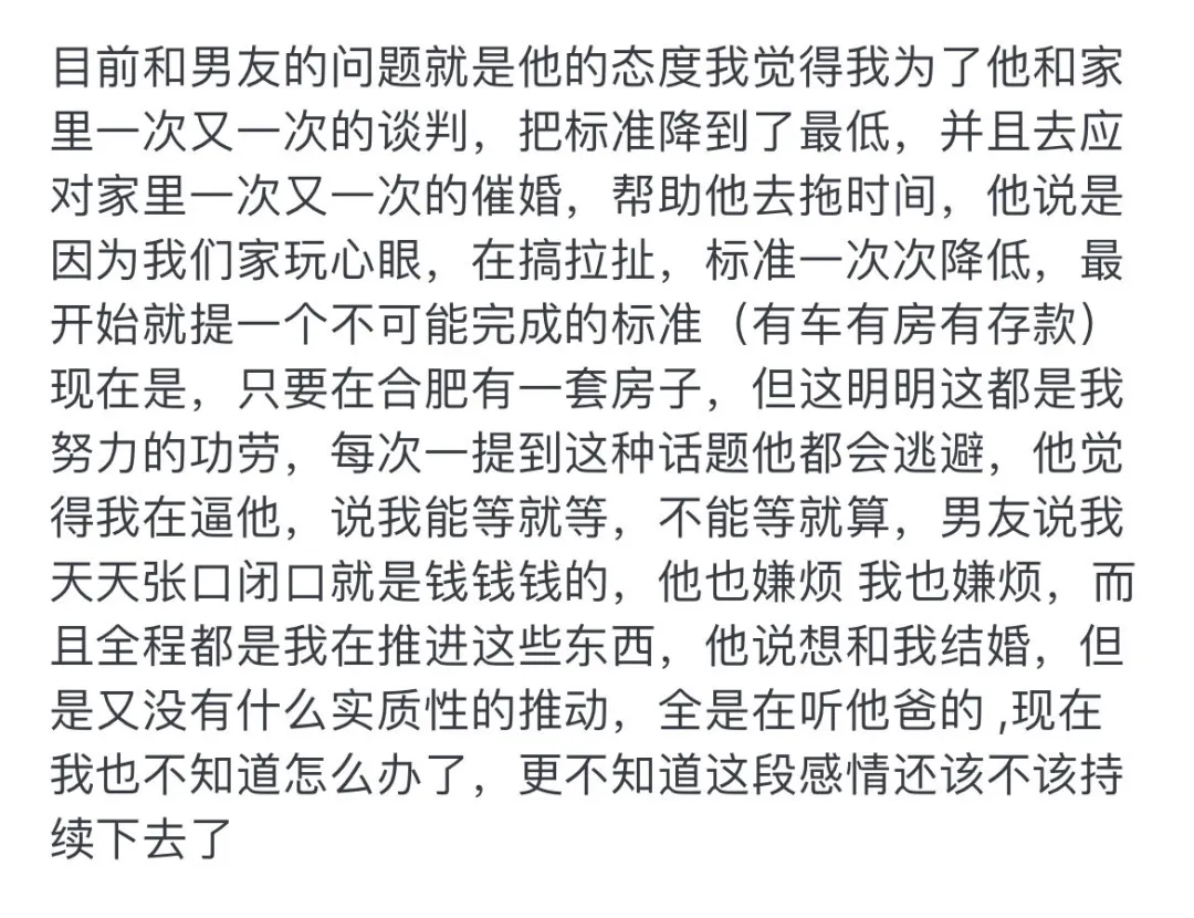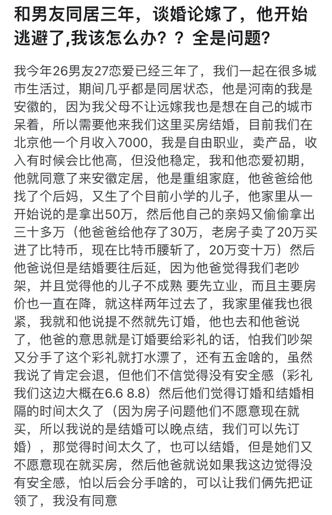 在传统观念里,女方跟男方同居,被视为一种“价值损耗”。同居的时间越长,男方的家庭就会默认女方已经是他们家的人了,若要因为娶她回家再花掉一大笔钱,就是浪费。双方一旦谈崩,女方要为自己青春买单,也要为面对自己在这场博弈里输掉了感情和人的双输局面,所以女方一般都是“投鼠忌器”。这也是题主一家面临的局面,不得不在一次次的谈判中,降低了自己的标准,只为能把这场婚事顺利进行。②同居等同于试婚,提前“享用”婚姻权利,降低了对方的购买欲