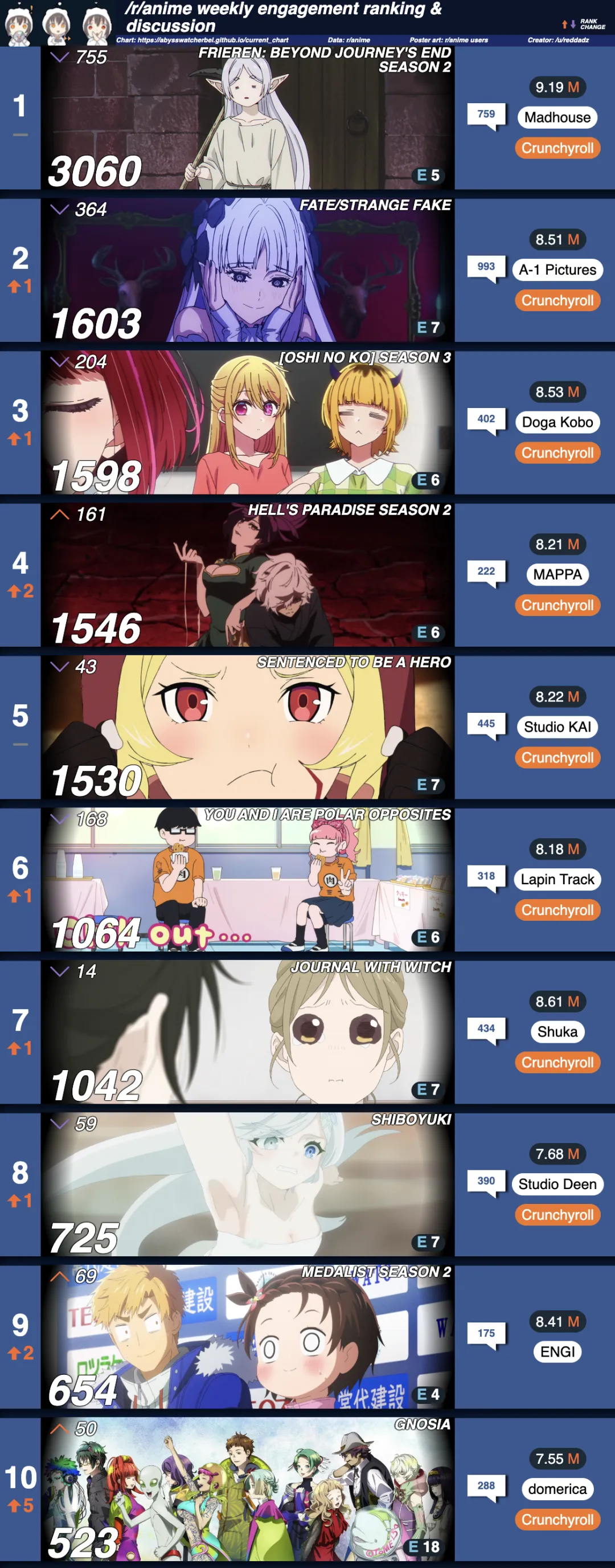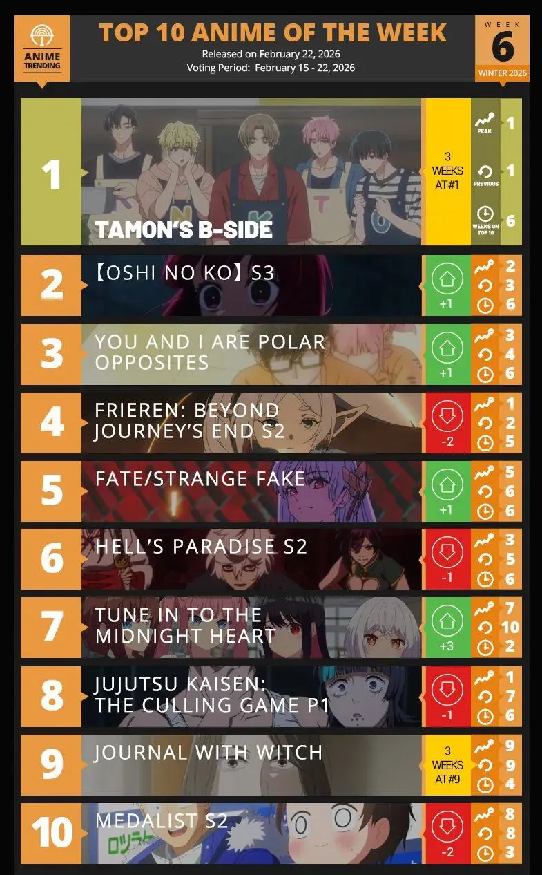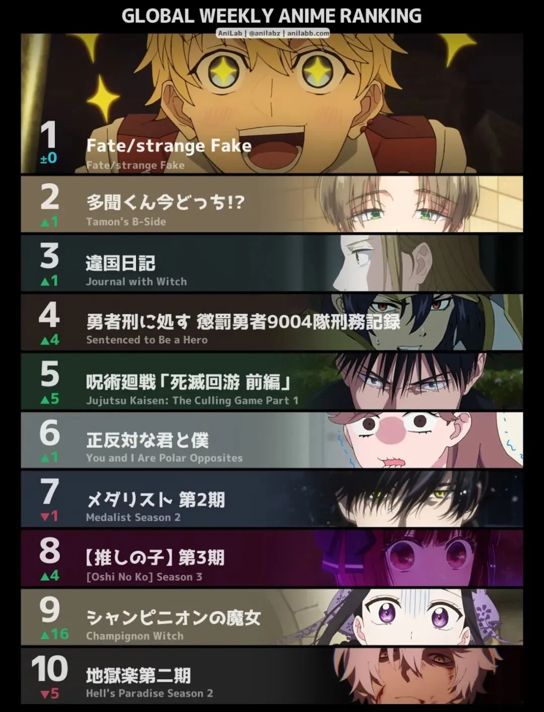 日本的榜单依然有咒术,总集篇也照上不误,可惜芙莉莲停播就没办法了。由于停播的关系,上周排名第2的《Fate/Strange Fake》正好取代芙莉莲,登顶冠军。