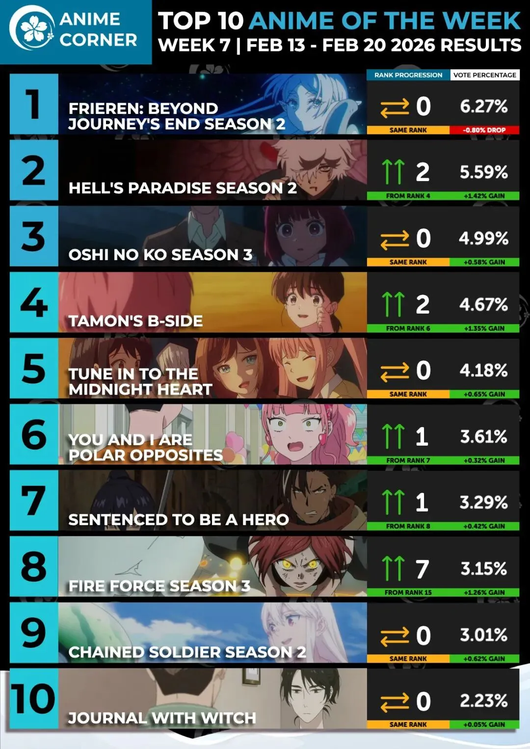 上周《芙莉莲》和《咒术回战》停播,所以欧洲AC榜和北美贴吧没有《咒术回战》,《芙莉莲》是周五播出的,算另一周,所以还有。在东南亚这边《多闻君》继续保持强劲势头 ,顺利蝉联冠军。合宿拍摄期间,敬人说出了他成为偶像的契机,原来这么做是为了减轻妈妈的负担,还有赚钱供弟弟读大学。歌夏在海边发现多闻正在用手机拍寄居蟹,于是上去和他搭话。多闻的脸凑得很近,从后面看像是kiss,樱利正好从后面看见了这一幕,误以为他们两人在接吻,醋意大发。《推子3》上升1位,帽子被记者拍到和导演一起回事务所,直到早上才出来,疑似靠枕营业(潜规则)上位。虽然帽子什么也没做,但被人拍到就已经寄了,怎么解释都没用。《相反的我和你》也上升了1位。这番真的很有趣,刚开始以为是《更衣人偶》那样的甜甜恋爱剧,但其实是一部群像剧,每一对CP都是个性相反的,但又很神奇的能走到一起。本周《咒术回战》总集篇AC榜不参与排名,其他番基本上就换了一下位置,相较上一周来说变化不大。《炎炎消防队3》上升7个位置再次回到前十,《地狱乐》本周有主角队伍合力攻打天仙的精彩打斗,作画观赏性拉满,排名从第4升第2。《判处勇者刑》换地图了,新的城镇很有无职内味,美术背景真的太像了。虽然没有战斗,但在两个新角色的加持下排名稍有回暖。《Fate/strange Fake》第7周排名11位,还是没能返回前十。《靠死亡游戏混饭吃》顺位12,《金牌得主2》13,同样也很微妙。