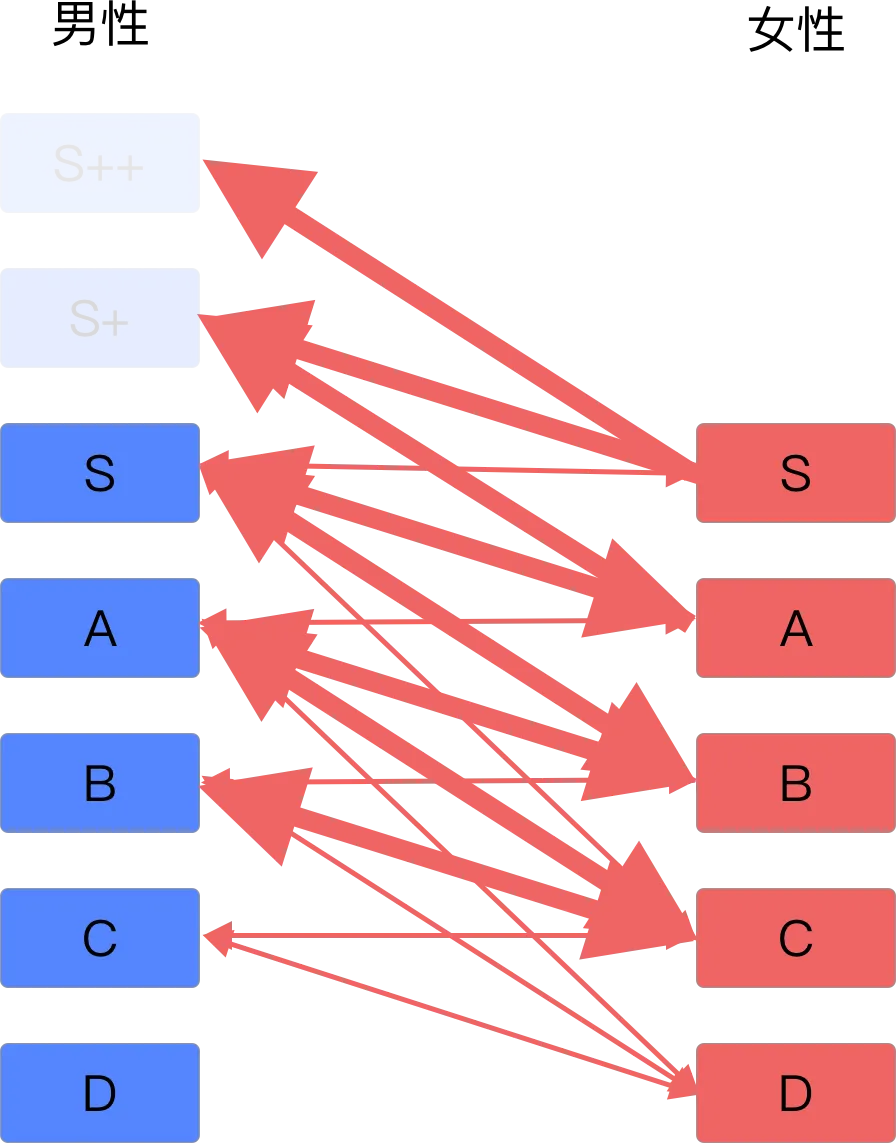 这种择偶偏好的差异,使得越是优质的女性(S女),期望越高,能够符合期望的异性则越少,结婚难度更大。而最底层的男性(C男、D男),则会被几乎所有女性所无视。