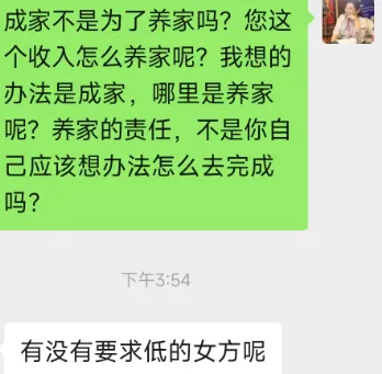 他的回答是:我收入不高,所以想找家庭条件普通、经济要求不高的女生。