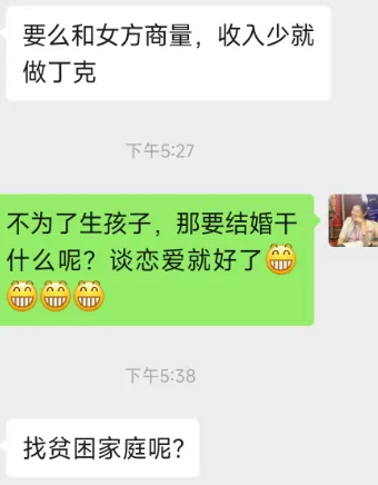他还跟我说:我收入少,所以对女生收入也没要求,实在不行,也可以接受丁克。
