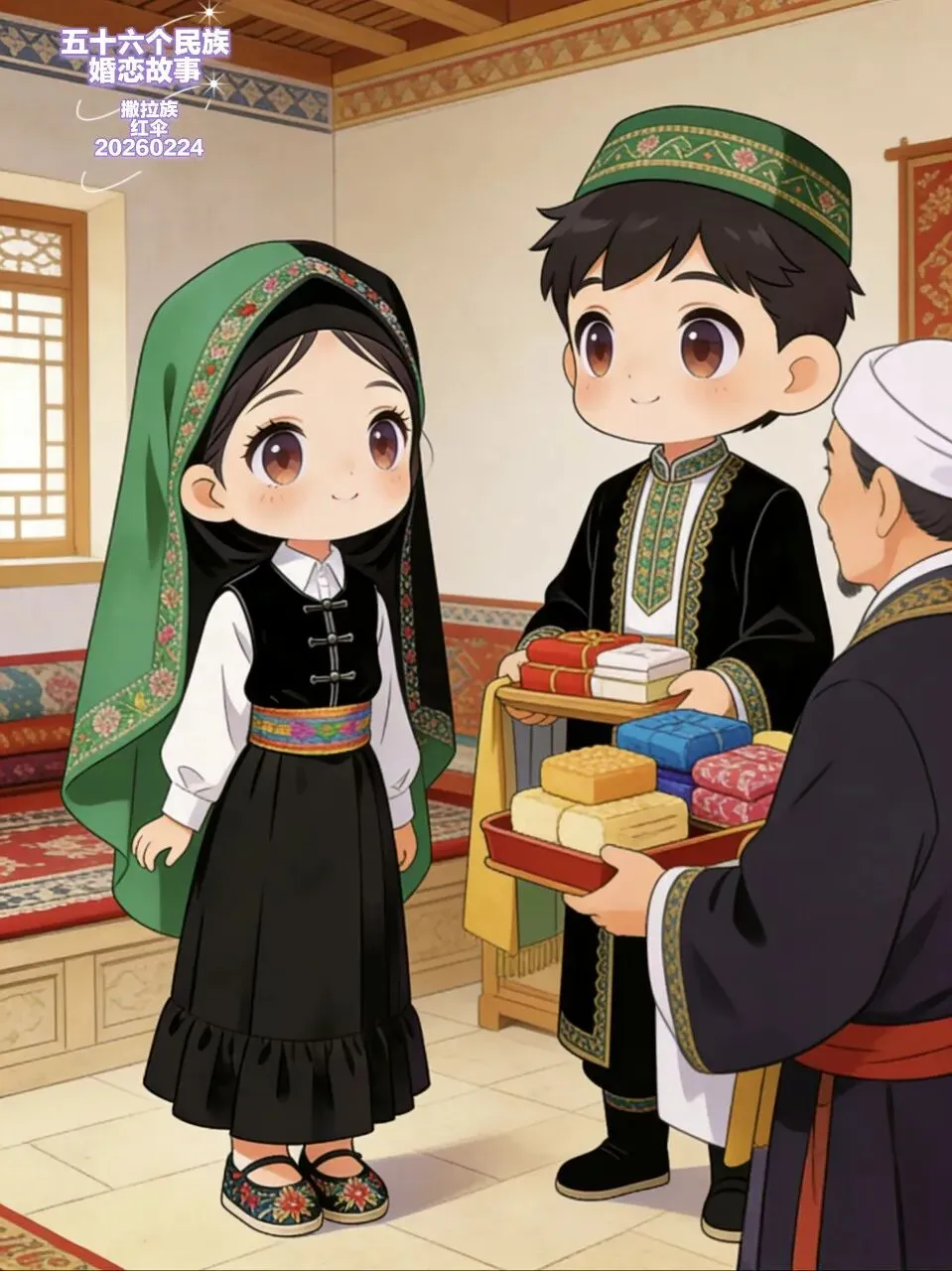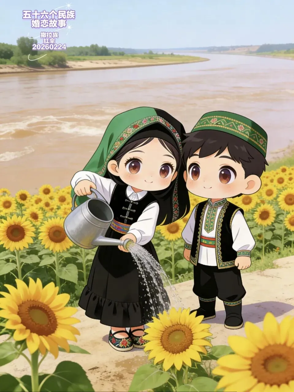 那天,哈桑的阿爸带着媒人,提着四色礼,来到了阿娜家。阿娜躲在门后,听见媒人用撒拉语说着哈桑的好,说他勤劳、善良,是个可靠的小伙子。她的心像揣了一只小兔子,怦怦直跳。当母亲接过那包带着葵花香的细茶时,阿娜再也忍不住,转身跑进了葵园,把哈桑送的泉水,一滴一滴浇进了向日葵的根里。她知道,她的爱情,就像这向日葵一样,已经在清水的灌溉下,深深扎下了根。