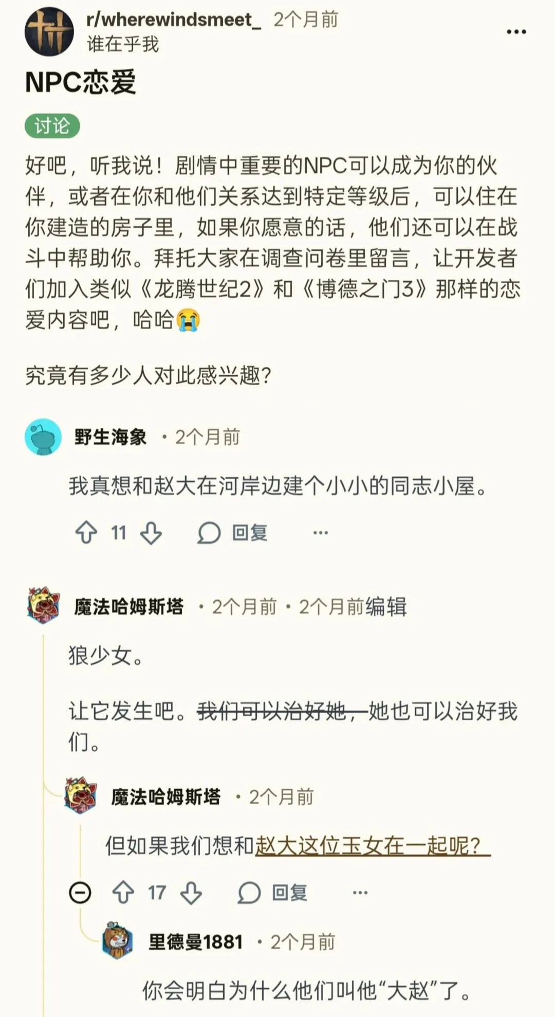 有想嫁给赵大的,还有其他NPC角色的(因为外网翻译和国内的中卫意思不一样),说实话,其实这种想法国服也有含蓄的。