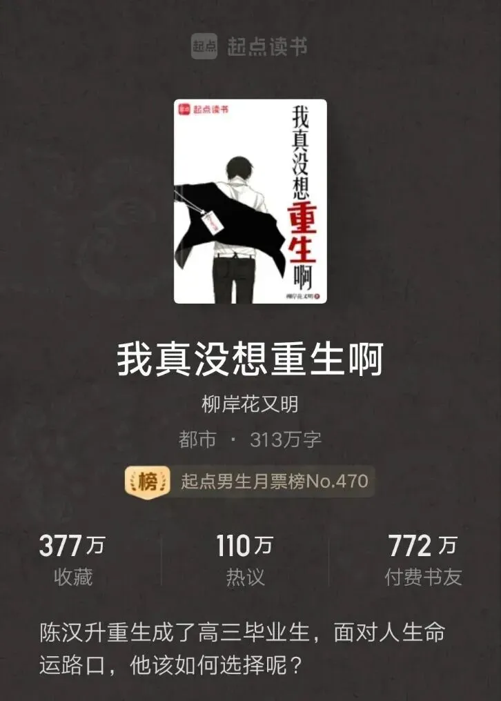 这本书已然成为重生都市文最长的河和最高的山了。虽然作者柳暗花又明又发布了新书《都重生了谁考公务员啊》,但还是难以超越自己的前作。