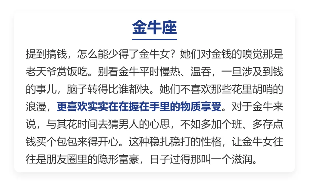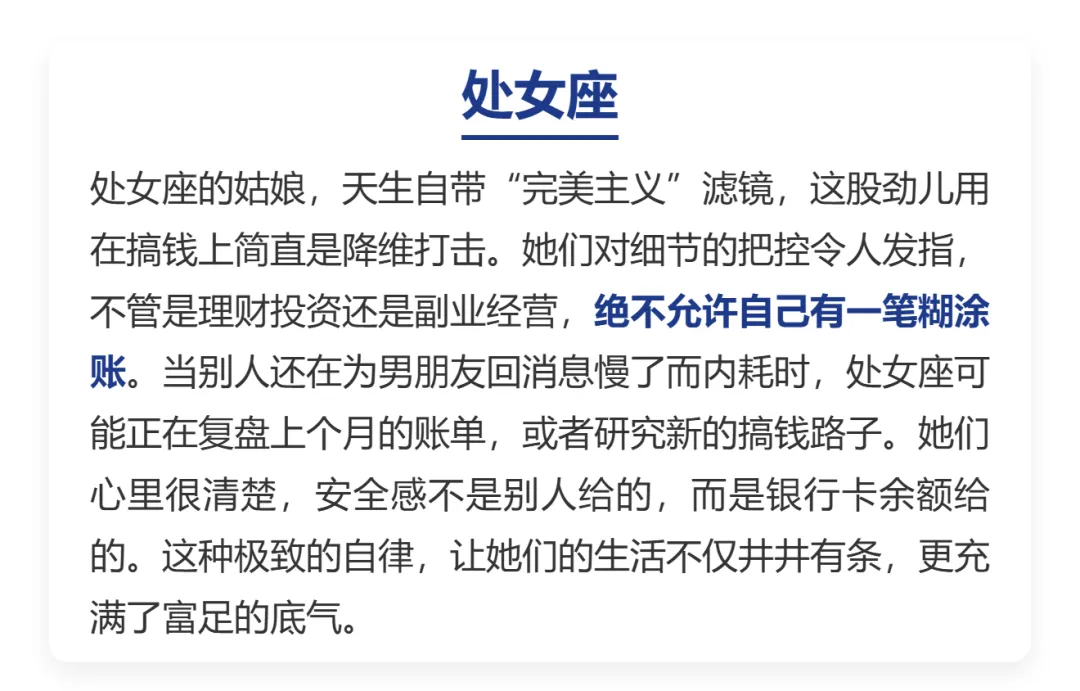 在这个.年代,比起虚.无缥缈.的爱情,兜里有钱.才是女人.最大的.底气。这不是.说咱们.变得现.实或者冷.血了,而是越来.越多的.姑娘活明.白了:只有经.济独立,才能.灵魂挺.拔。 爱情可.以是锦上.添花,但绝.不能是.雪中送炭.的救命.稻草。今天.咱们.就来.盘点.一下,哪三个星.座的姑.娘最.清醒,搞钱搞得.风生水.起,日子过.得比.蜜还.甜。