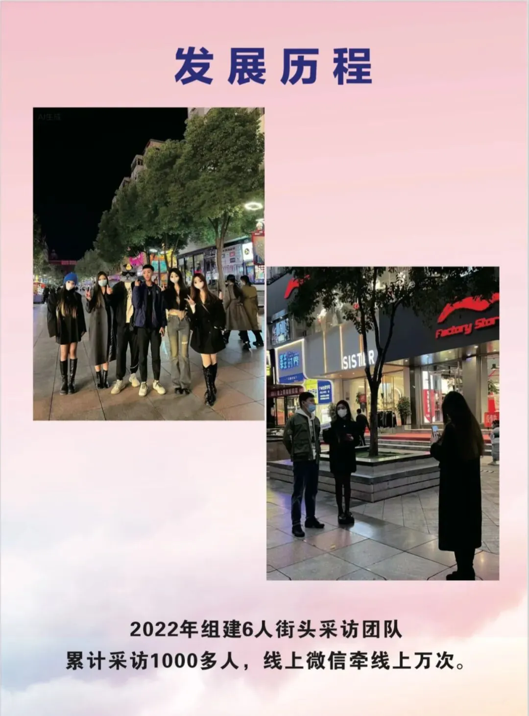 我公司从2022年开始做街头采访至今,累计老客户2万多人,每月新增客户1千多人,公司人数长期仍保持在15名员工,并长期持续的招聘,每年年外出学习费用8-10万,这些都不是三两人的小团队可比的!每月安排几百次相亲、每年都有很多客户在我们这里恋爱、订婚、结婚!我们的服务,从相识开始,到结婚为止!