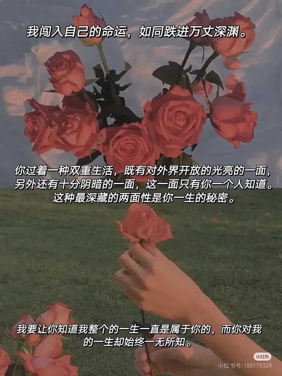 2.你过着一种双chong生活,既有对外界开放的光亮的一面,另外还有十分阴暗的一面,这一面只有你一个人知道。这种zui深藏的两面性是你一生的秘密。