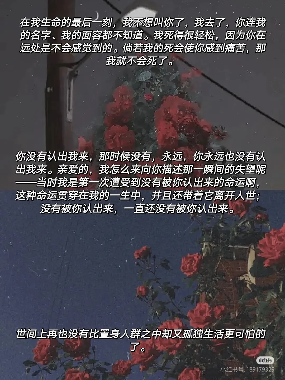 4.在我生命的zui后一刻,我不想叫你了,我去了,你连我的名字、我的面容都不知道。我si得很轻松,因为你在远处是不会感觉到的。倘若我的si会使你感到痛苦,那我就不会死了。