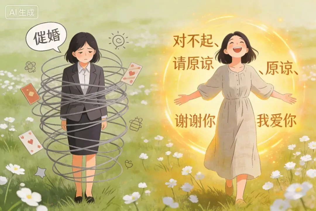 当你开始尝试那四句真言——对不起、请原谅、谢谢你、我爱你——你会在一次次默念中,触碰到那些被忽略的情绪角落。那个因为“还没结婚”而暗自自卑的自己,那个面对父母期待时充满愧疚的自己,那个在深夜刷着朋友圈、看着别人晒婚纱照而泛起淡淡酸楚的自己。