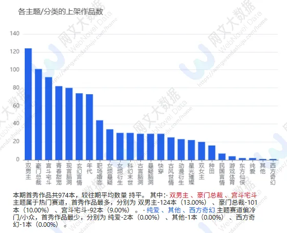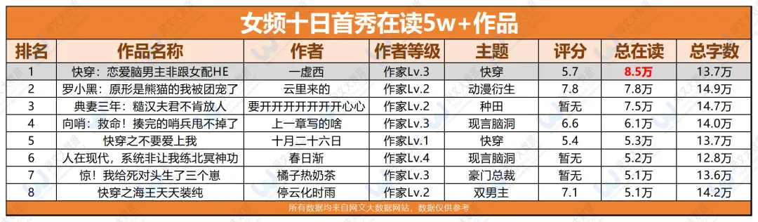 这一期女频首秀作品数量上双男主稳坐头把交椅豪门总裁和宫斗宅斗紧随其后青春甜宠和现言脑洞也各有80+本入场动漫衍生平均在读1937最高冲到了6497女频衍生平均在读1457,最高4632双男主数量124本但平均在读只有1169,天花板5113供给量大但爆款难出本期首秀当日在读最高的是一本《咒回:在下云璃,高专最强剑仙》,6497的UV咒术回战同人,剑仙设定二次元DNA又动了
