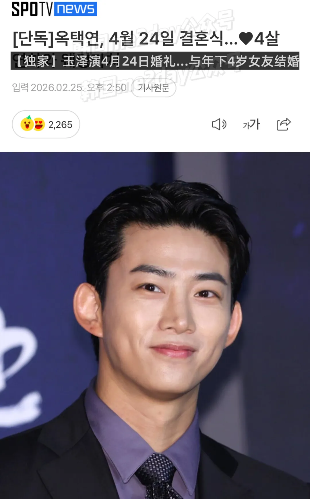 去年玉泽演在2025KBS演技大赏中获得了迷你剧部门优秀奖,当时他曾在获奖感言中表示:“最后,向我的准新娘表示衷心的感谢,我爱你们”,一时成为了热议话题。
