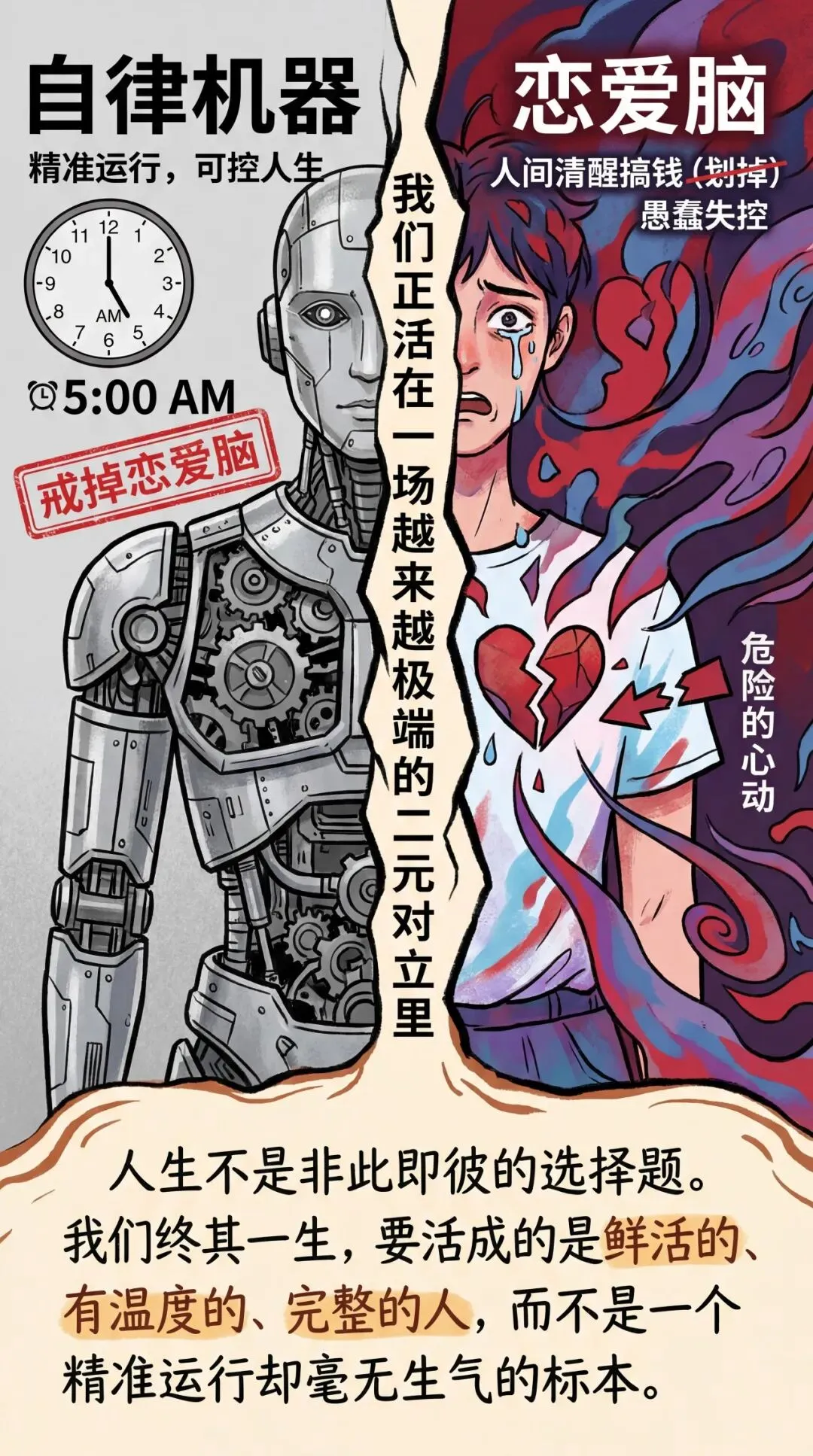 可我们好像忘了,人生不是一道非此即彼的选择题,我们也不是只能在“自律的机器人”和“恋爱脑的傻瓜”之间二选一。我们终其一生,要活成的是鲜活的、有温度的、完整的人,而不是一个精准运行却毫无生气的标本。