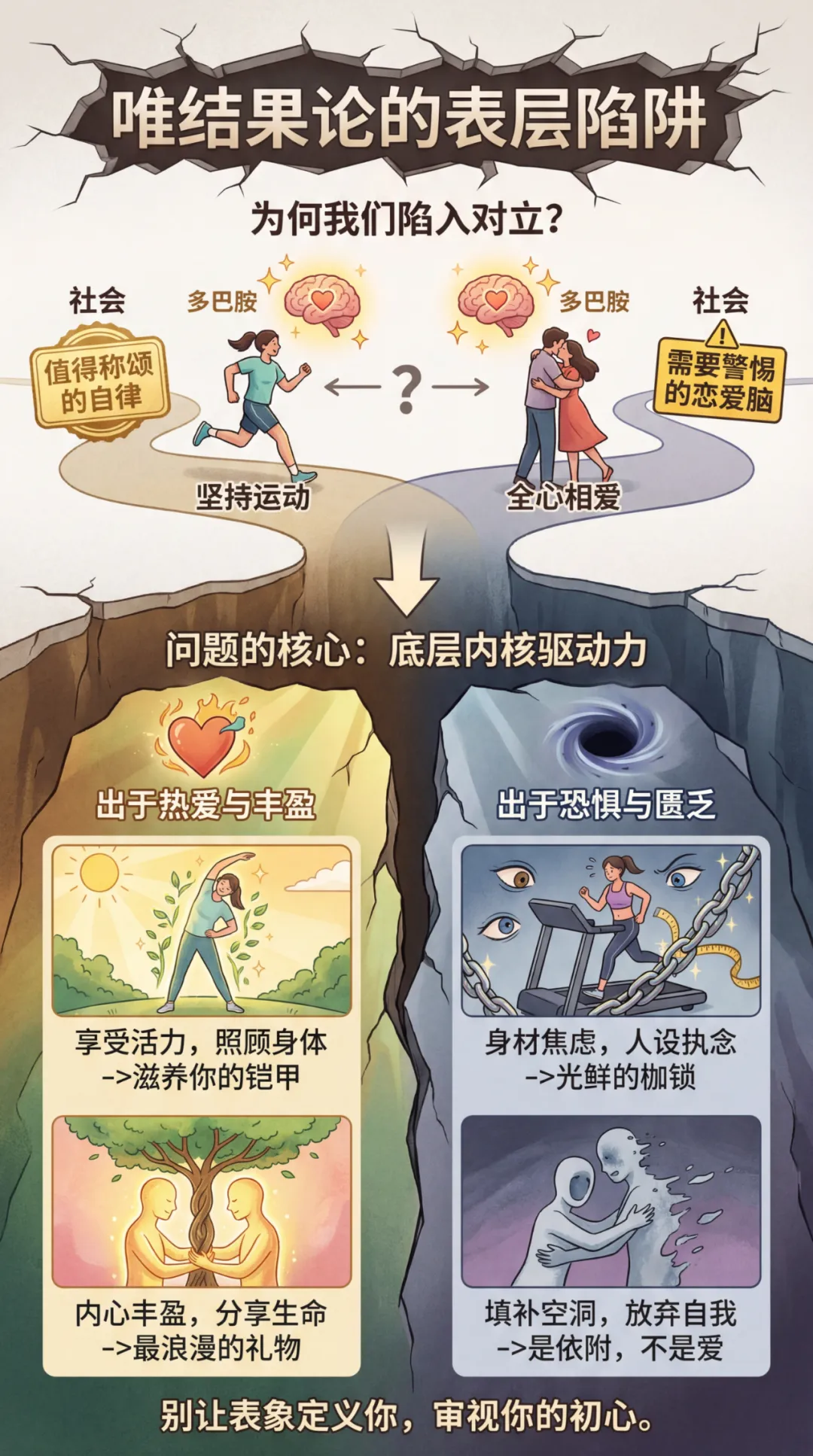 大家总在争论,同样是多巴胺带来的愉悦,为什么坚持运动就是值得称颂的自律,全心相爱就是需要警惕的恋爱脑?可问题的核心,从来不是多巴胺本身,也不是行为本身,而是触发这个行为的底层内核——你做这件事,到底是出于热爱,还是出于恐惧?