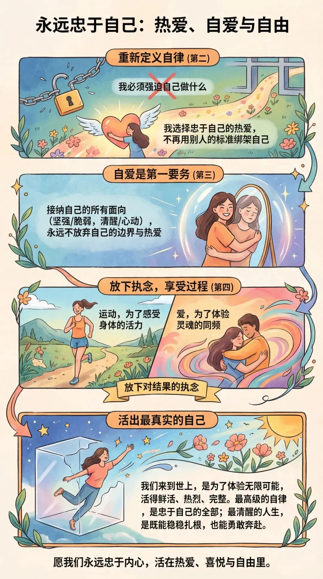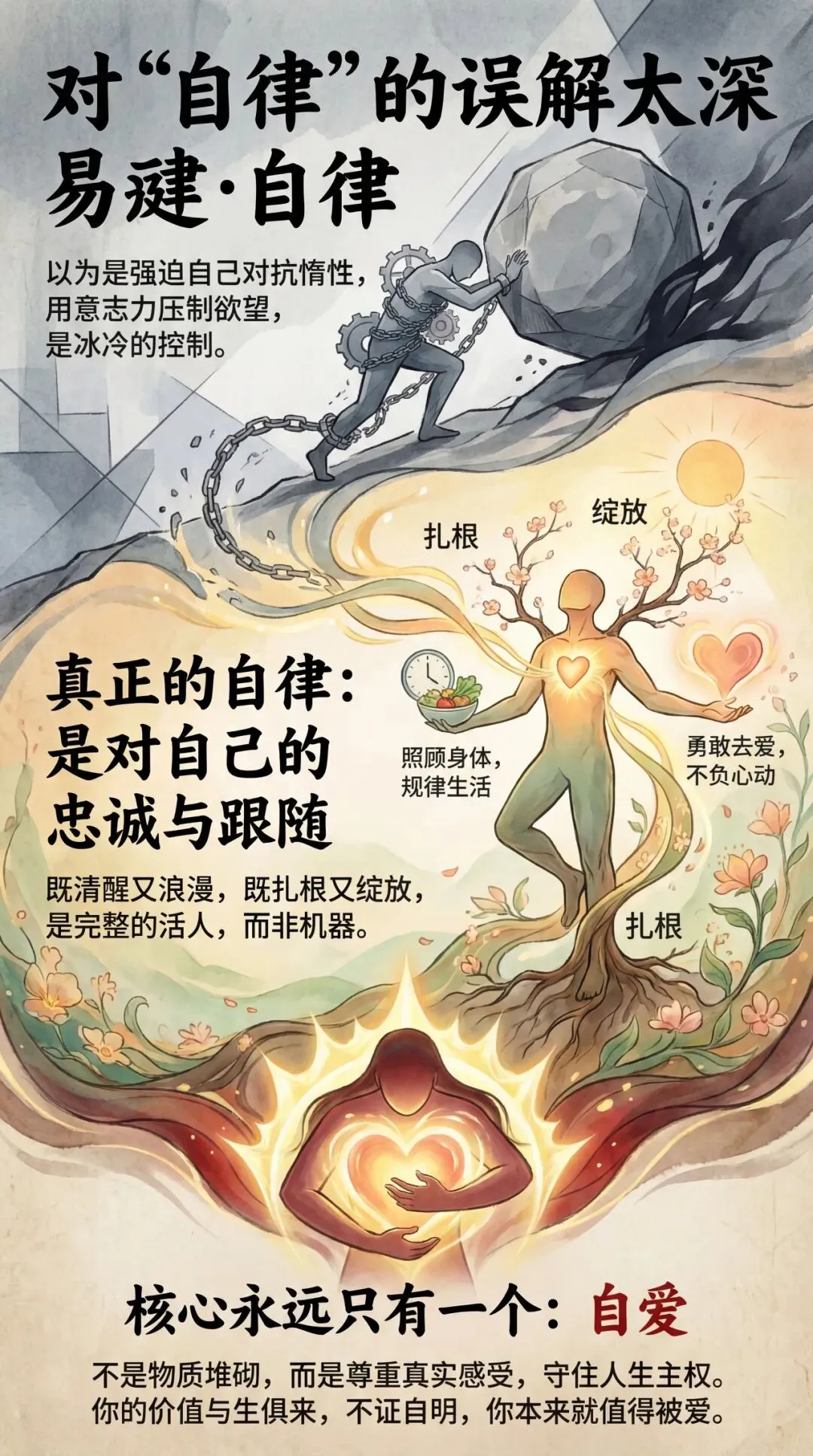 真正的自律,不是让你只敢对身体发力,不敢对真心坦诚;不是让你只敢活在确定的闭环里,不敢走向未知的热爱里。而是你既可以好好照顾自己的身体,规律作息、认真生活,给自己稳稳的底气;也可以勇敢地敞开心扉,全情去爱、去体验,不辜负每一次心动。它不是让你活成一个只有逻辑、没有温度的机器,而是让你活成一个既清醒、又浪漫,既扎根、又绽放的完整的人。