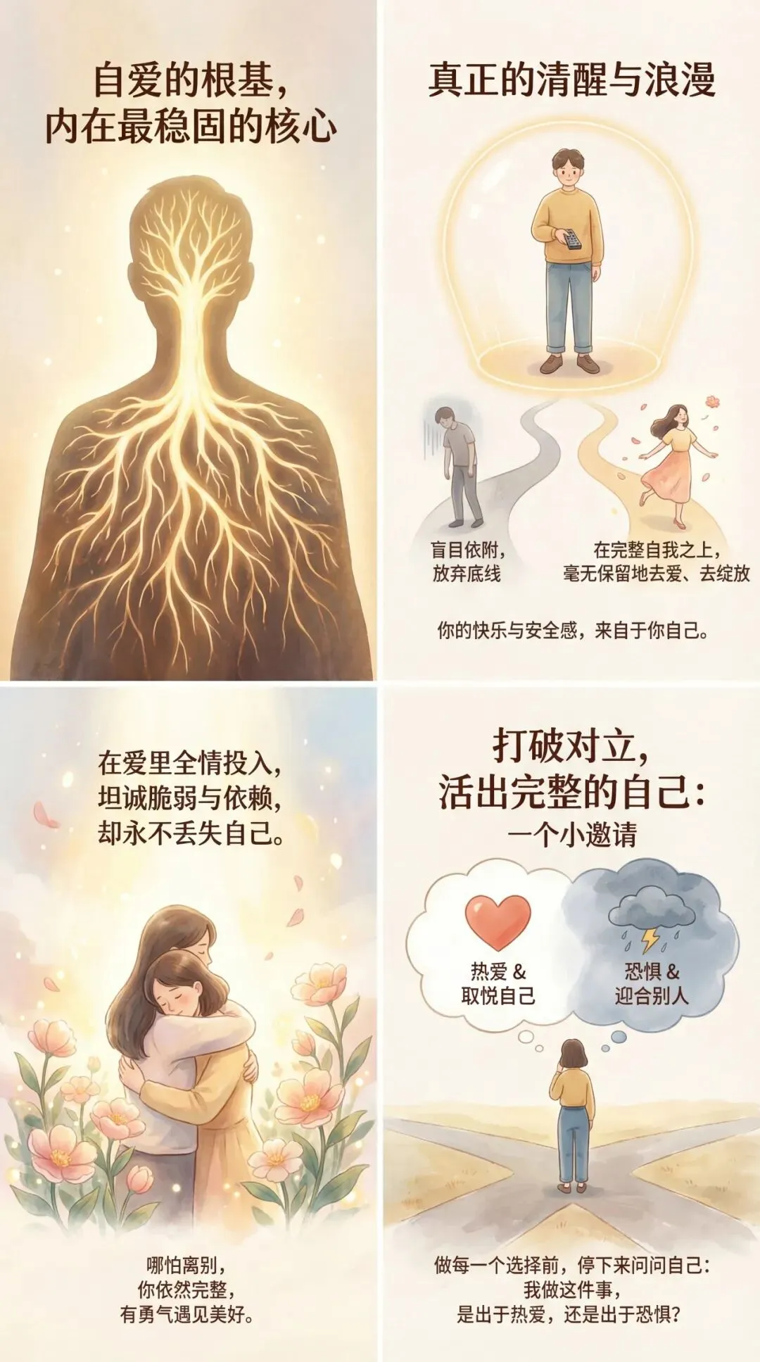 当你建立起了自爱的根基,你就拥有了内在最稳固的核心。你可以在爱里全情投入,坦诚自己的脆弱与依赖,却永远不会丢失自己;你依然会守住自己的边界,坚持自己的热爱,永远把人生的遥控器,牢牢握在自己手里。你可以坦然接受爱里的所有未知,因为你的快乐、你的安全感,从来都不来自于别人,而是来自于你自己。哪怕一段关系最终走向离别,你依然是完整的,依然有勇气,去继续遇见生命里的所有美好。