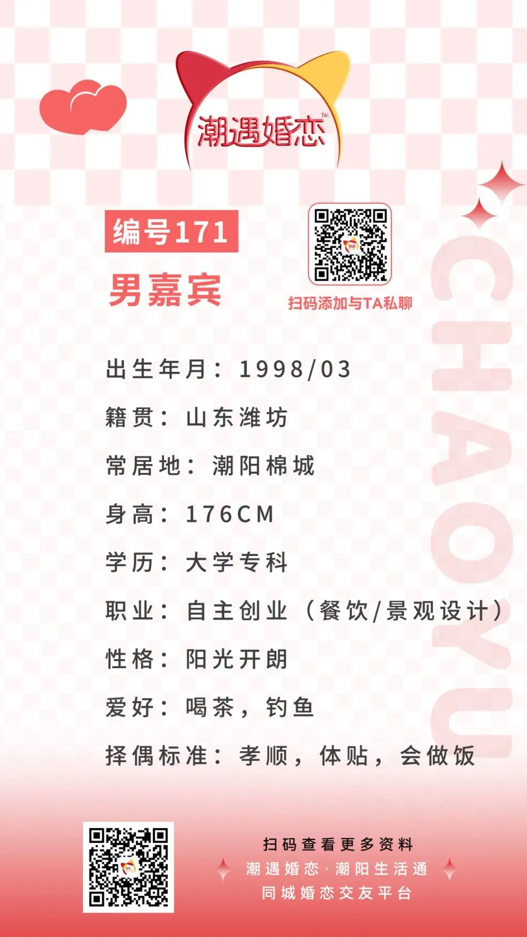 【潮遇婚恋】嘉宾:编号171男嘉宾 · 常居潮阳棉城,年收入30W+