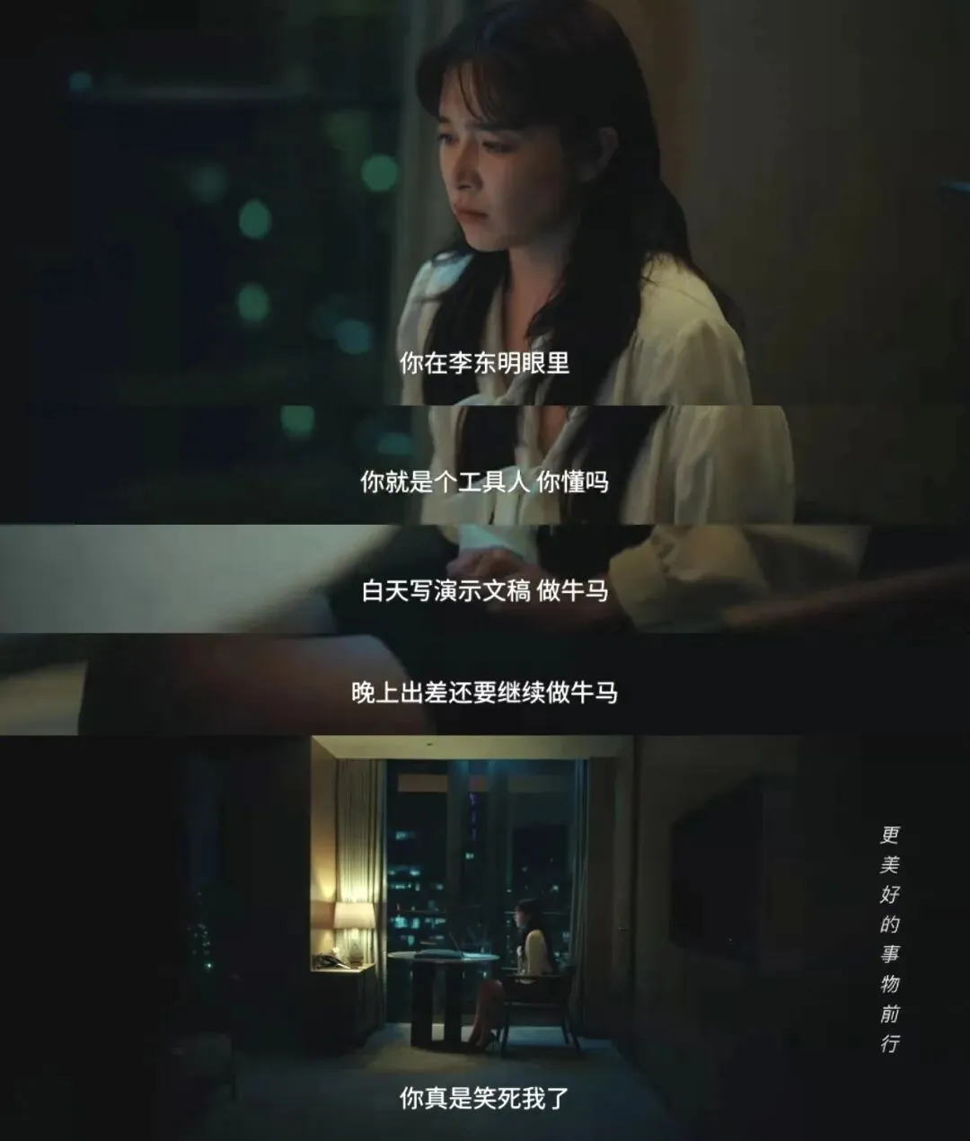 上有翻脸比翻书还快的领导。 这领导把下属当奴隶使,早上五点就把人叫起来去陪客户,完事儿了立马跟追债似的要报告。有一场戏我印象特别深,乔海伦刚加完班躺下,手机一震,领导发消息:报告呢?她盯着屏幕那个表情,又绝望又麻木,我看着都想替她叹气。