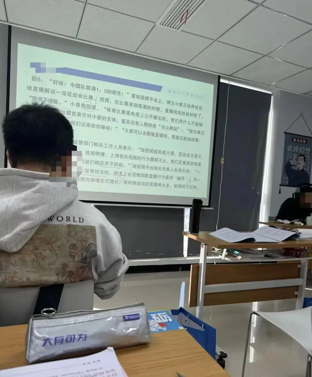 上课老师讲题,郝正伟如果对了就打个响指高叹一声“bingo”,如果错了就惋惜一句“哎呀,太粗心了”。他专业是阿拉伯语,只能考三不限,总是对多错少,每次行测卷子都能拿80分以上,舍友还透露他每晚拿小夜灯学习到深夜一两点。