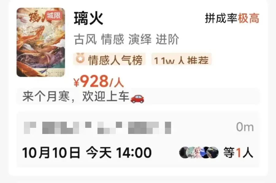 一场恋陪本通常花费在300元以上,上不封顶,这个价都够玩两三场推理本了,大热门《璃火》在北京一度炒到928元/位。