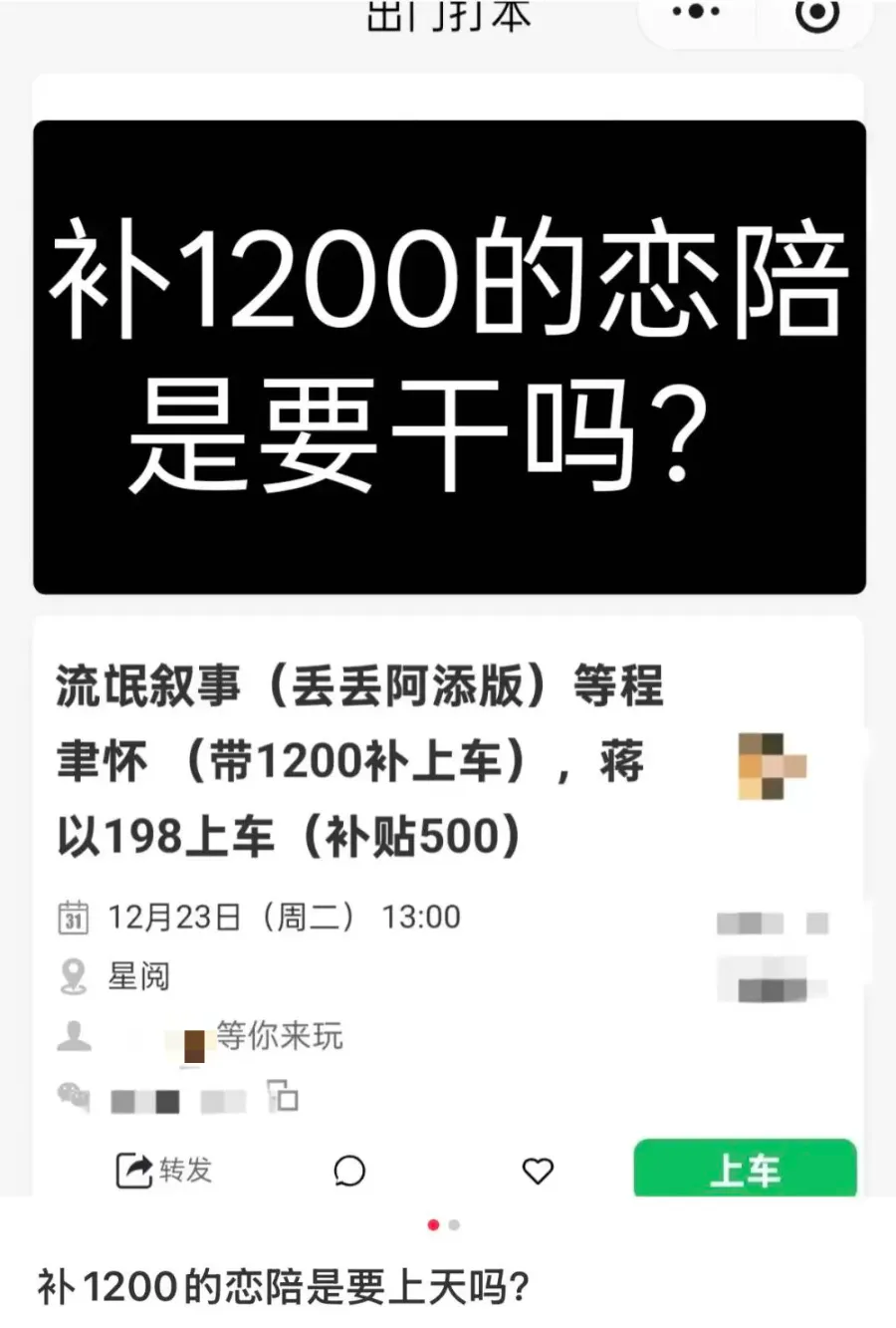 补贴一两百是圈里常态,600、800元都很常见,《流氓叙事》某个城市补贴已经喊到1200元,更有恋陪姐补贴1400元上车《窃云台》。