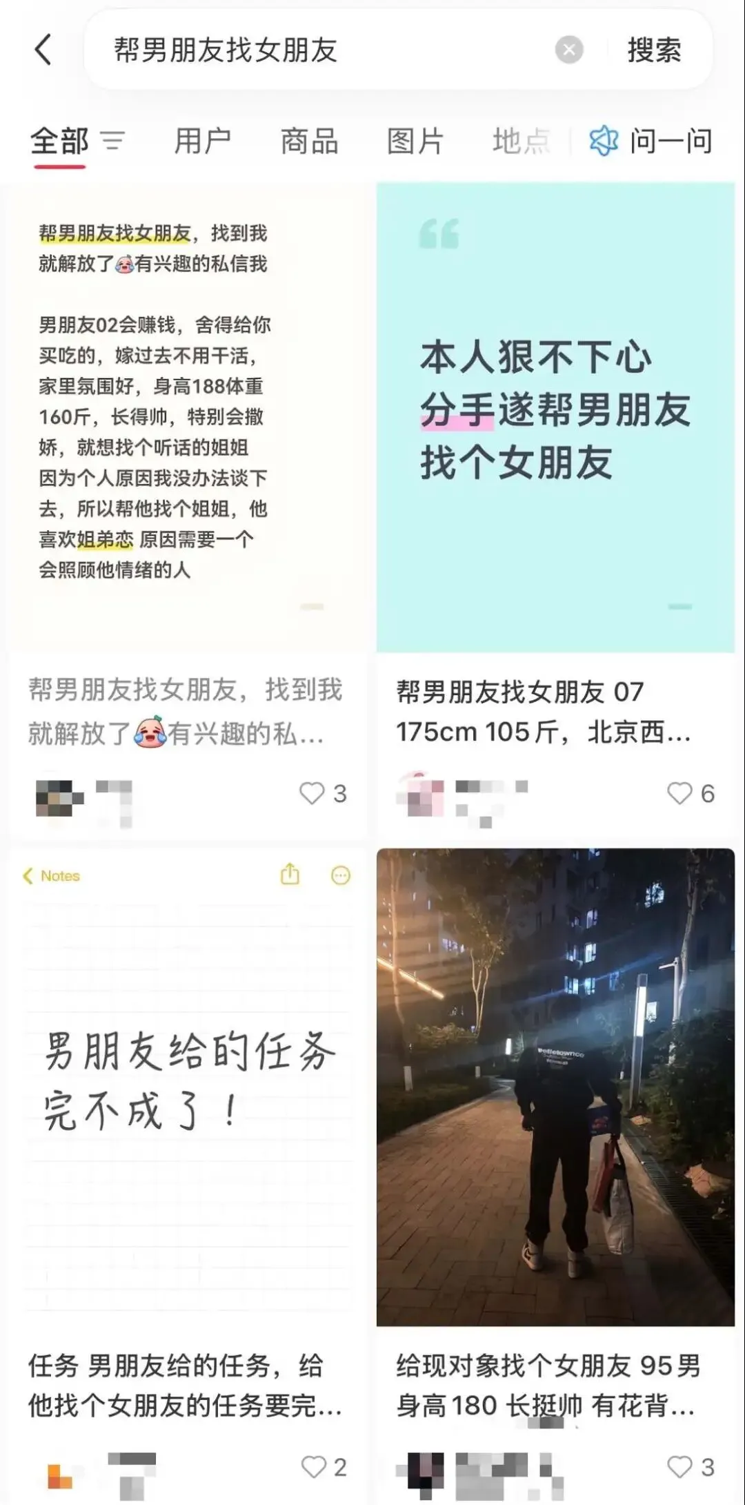 ● 小红书搜“帮男朋友找女朋友”帖子多到刷不完