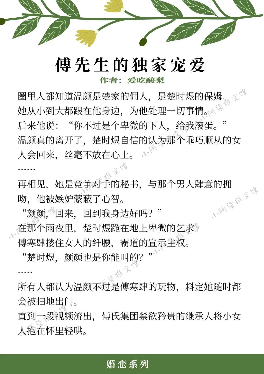 ❖《傅先生的独家宠爱》作者:爱吃酸梨(温柔坚韧小保姆vs深情霸道总裁,先婚后爱,久别重逢,暗恋成真,追妻火葬场)