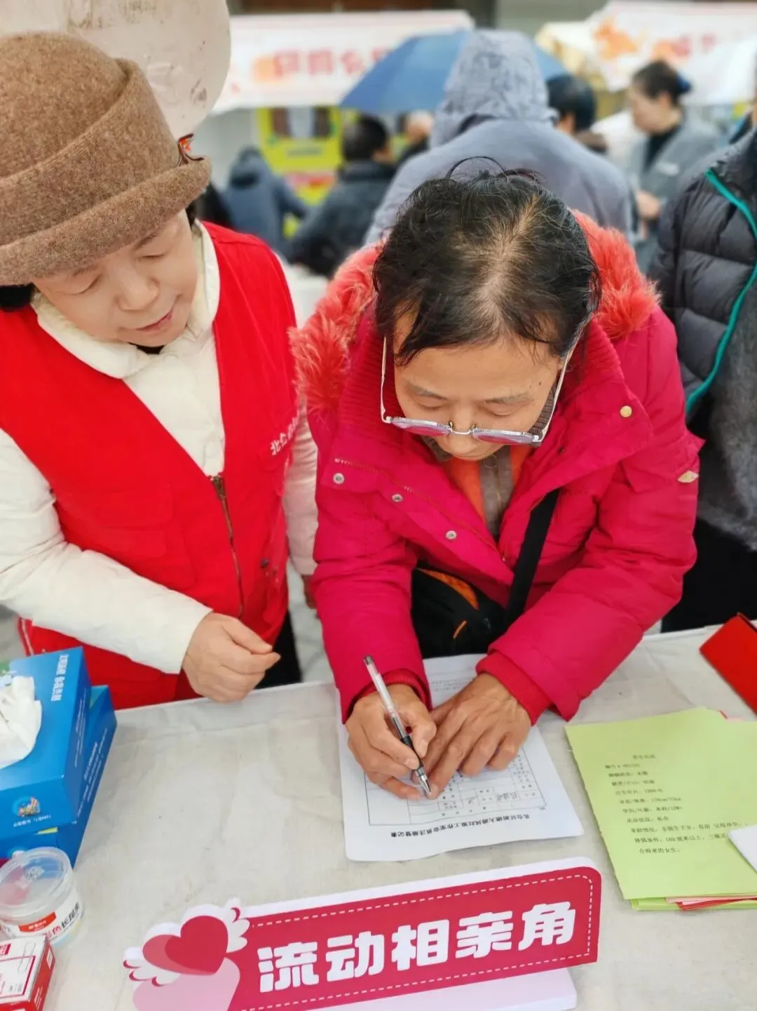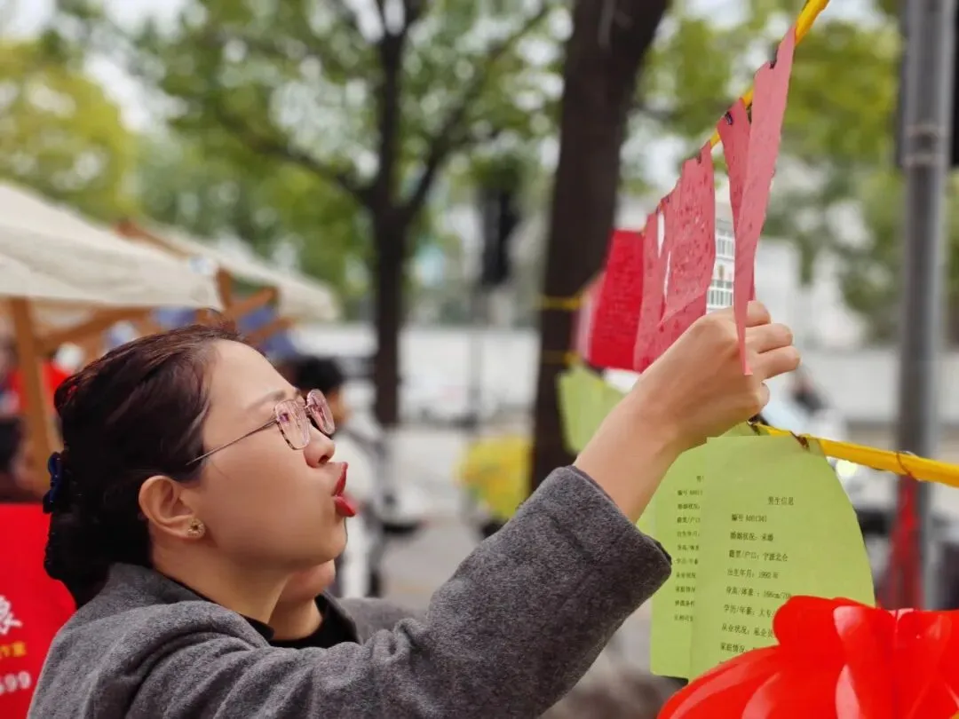 下午的活动现场,挂着“流动相亲角”标识的服务点被热情的居民围得水泄不通。红娘志愿者们分工明确,有条不紊地开展工作: