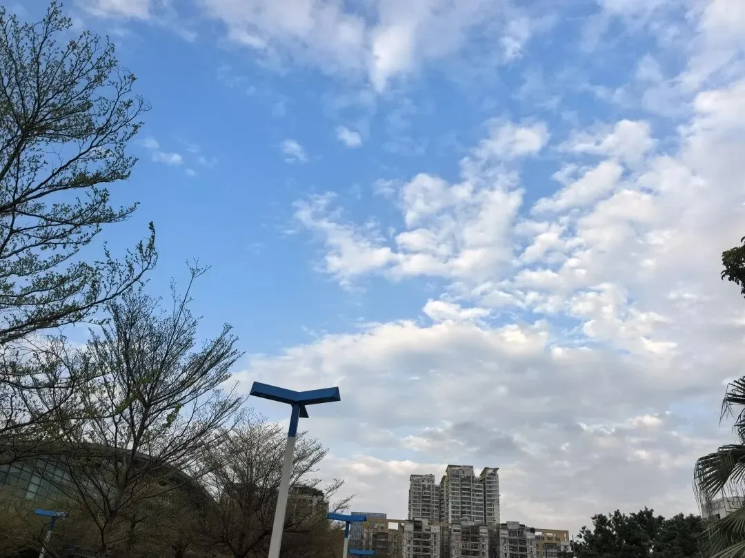 天空是温柔的恋人,她总以最柔软的姿态,轻轻覆盖在楼宇的肩头。清晨,她用淡蓝的纱衣裹住每一栋楼的轮廓,让钢筋水泥的棱角都变得朦胧;傍晚,她又把晚霞织成披肩,披在最高的那栋楼上,像在宣告:“这是我的偏爱。”