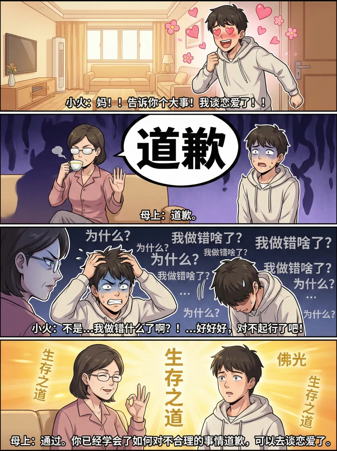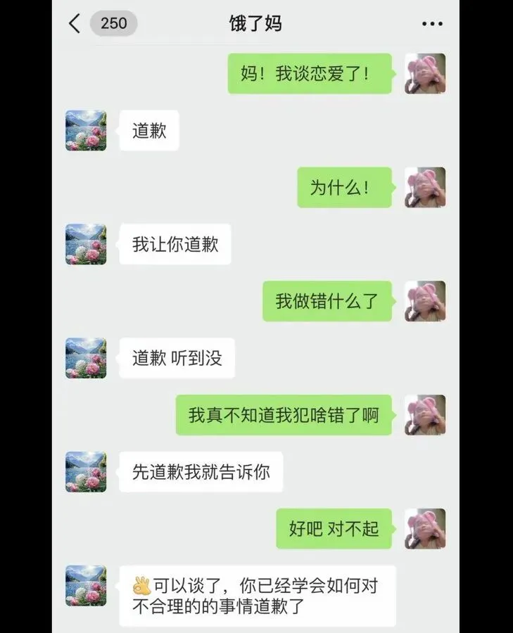 text:"母上:通过。你已经学会了如何对不合理的事情道歉,可以去谈恋爱了。"