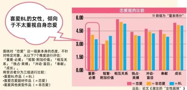 从研究结果来看,三类人群在自身的性别人格特质方面并不存在明显差异。喜爱BL作品的女性,并不存在否定自身作为女性的倾向。在将自我投射到虚构人物的情感与行为中这一点上,各群体之间也没有显著不同。真正存在差异的,是恋爱观。偏好男女恋爱题材的人群,普遍认为恋爱是必要的,并有助于个人成长;而喜爱BL作品的“腐女”,并不特别重视自身的恋爱。