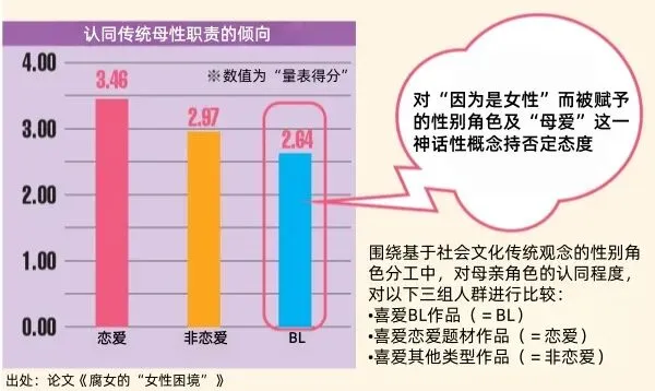 另一个显著差异,体现在对男女角色分工的认知上。偏好BL作品的人,相较其他群体,明显较少认同并遵循传统母亲角色。“因为是女性”而必须承担的社会角色,以及母性本能等带有神话色彩的观念,她们普遍持否定态度。