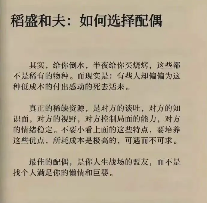 纯真已失 善良不在 门当户对都在想着阶级跨越 恋爱只是依附 婚姻都在兑付 一切皆可交易 一切都能算计 来,上筹码冯唐说:“女人最蠢的行为,就是不好好读书上进,而早早地谈恋爱,在低层找烂男人,被低成本的付出感动!”婚姻是人生中最重要的选择之一,它关乎我们后半辈子的幸福与安宁。让婚姻成为人生中最美好的风景,而非难以挣脱的枷锁。张爱玲说:“婚姻,我替你们试过了,人生的另一半如果选错了,往后余生,每一步都是错,你会尝尽人间苦楚,取舍两难。其实,相貌和财富都不那么重要,重要的是人品,是责任和担当,以及原生家庭刻在骨子里的三观和教养。 所以,选择和谁结婚真的不一样。有的人进入到你的生命里,会让你觉得人间值得,会成为你的光;而有的人,会把你的光都熄灭。”现在的婚姻都是自私的盘算,婚后就是无止境的互相消耗,早已脱离了互信互助的本质,所以都维持不久……虚静问道·且在道场