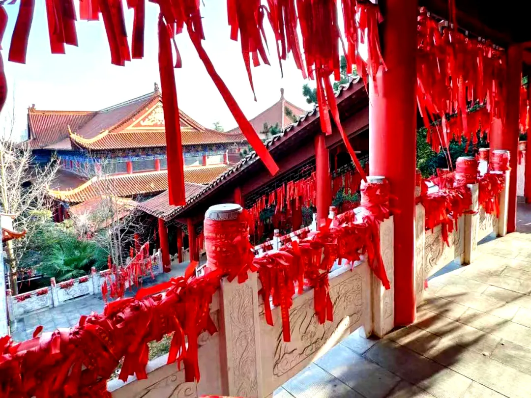 走过满是红色祈带的廊亭下