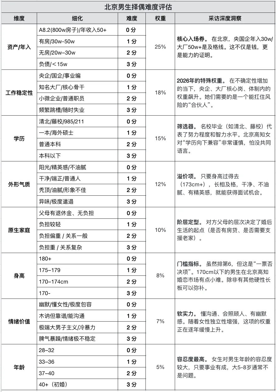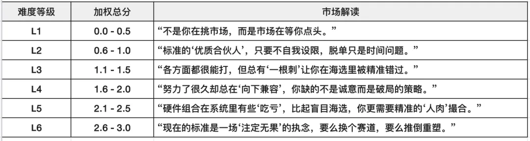 建议你在联系我们之前,先花 30 秒对照这张表给自己打个分。你会清晰地看到,基于你目前的软硬件条件和择偶要求,你属于哪个脱单难度等级(L1-L6)。