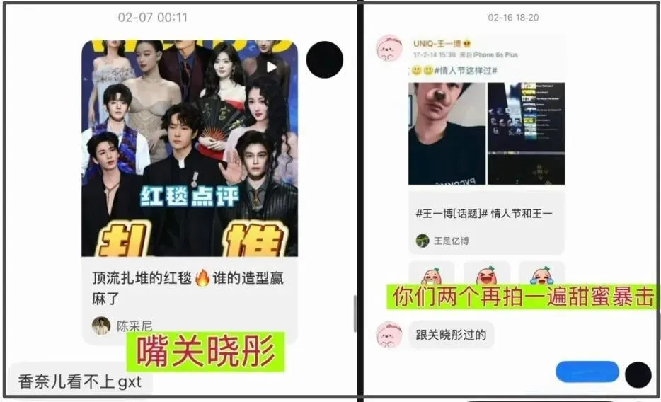 王一博和女友分享内娱红毯合集,超 10 位明星出镜,女友第一句话就吐槽关晓彤。过了几天,分享情人节动态时,女友还在赌气,让王一博去和关晓彤过情人节。