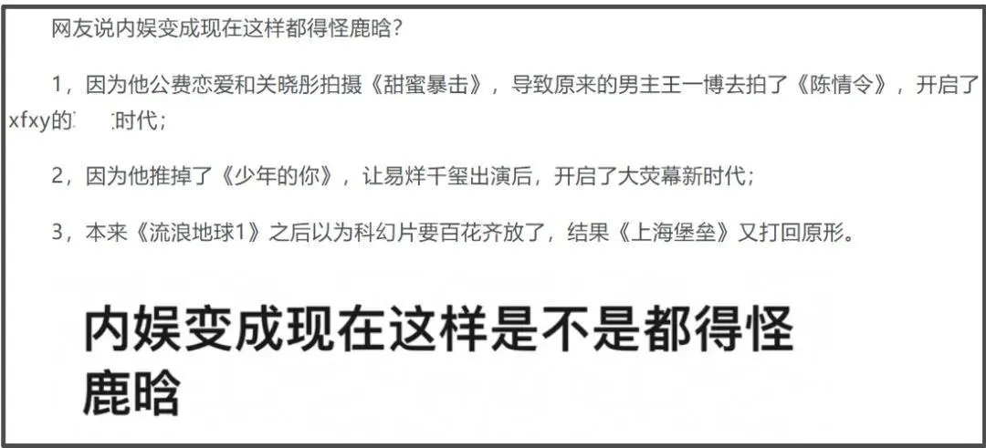 以前就有网友调侃,内娱变成现在这样,都得 “归功” 于鹿晗。他为了关晓彤接了《甜蜜暴击》,推掉《少年的你》,又拍了《上海堡垒》。因为鹿晗这一系列决定,肖战和王一博得以拍摄《陈情令》,易烊千玺和周冬雨合作《少年的你》,就此开启 2018 年内娱流量元年。