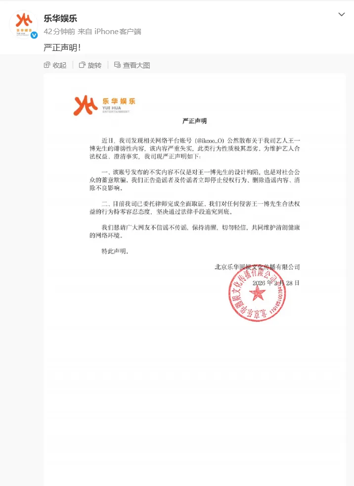 乐华第三次发声明,措辞升级:"王一博先生现在尚为单身。"