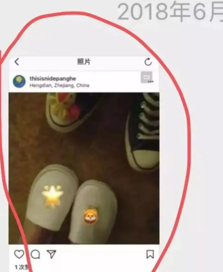 更劲爆的是,网友扒出綦美合的ins小号,有一张酒店拖鞋和墨绿色匡威太阳花鞋的合影,定位浙江横店,时间正是《陈情令》拍摄期间。