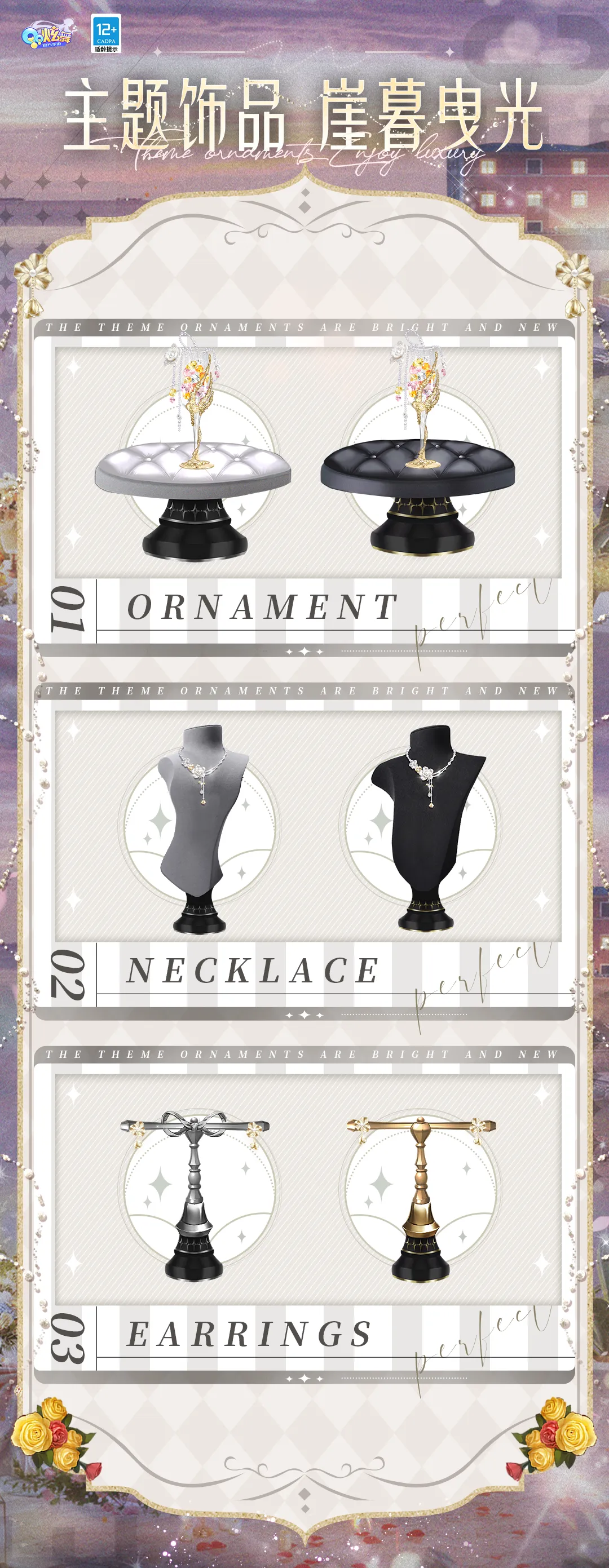 璀璨超凡时装-崖暮奢旅/璀璨超凡定制脸-崖暮微醺/超凡双飞-崖岸花笼/羁绊动作徽章-时坠安然/超凡浮云-崖岸露台/主题饰品/场景名片-冰漾柠澜&山墅清欢/蜕变体型轻奢时装-星玫软霜/蜕变体型轻奢时装-墨星软语将上架【藏宝之地-鎏金之庭】
