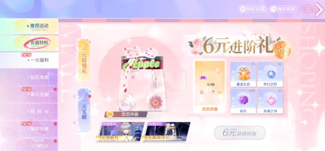 6元再得轻奢浮云-恋恋序曲、钻石*60、鎏金礼包*5、梦幻之影*2、灵魂之羽*2等进阶礼,享超值返利!