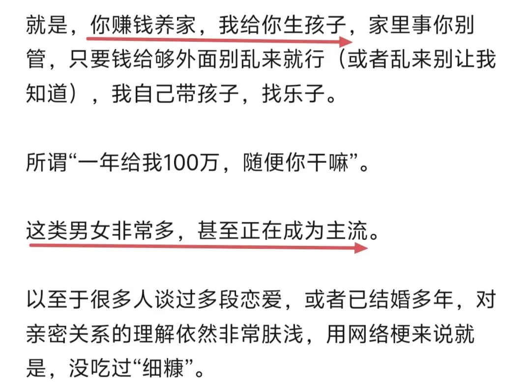 这类男生对婚恋的理解就是,我赚钱养家,给你钱或买礼物,然后和你发生关系,你给我生孩子(或者不喜欢孩子的可以不要)。